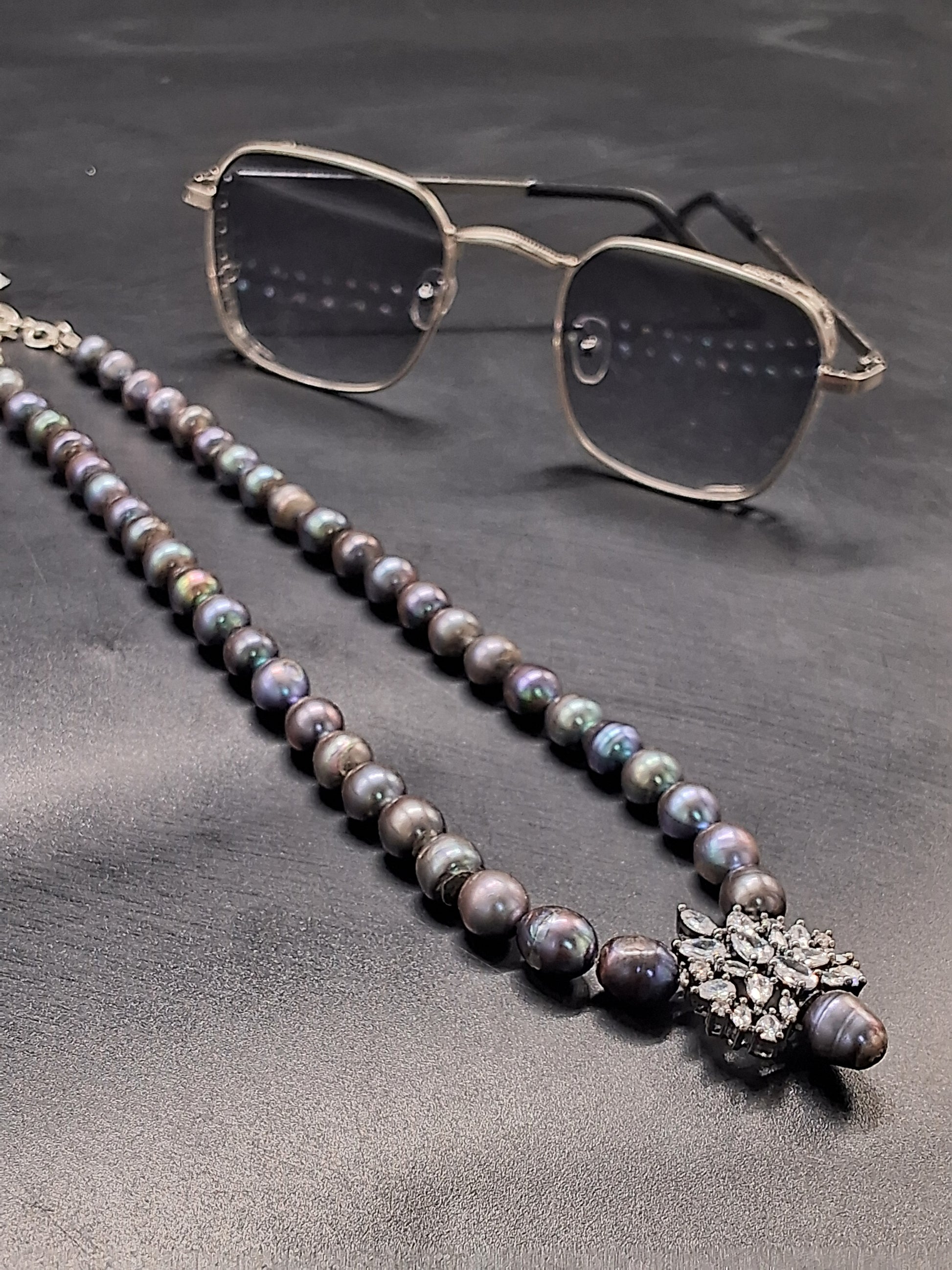 This handcrafted pearl necklace from Emryn blends the charm of deep iridescent charcoal-toned shell pearls with a dazzling diamond-style floral pendant. The pearls shimmer with subtle hues of midnight, violet, and silver—creating a bold, sophisticated statement that pairs beautifully with both Indian and Western ensembles.