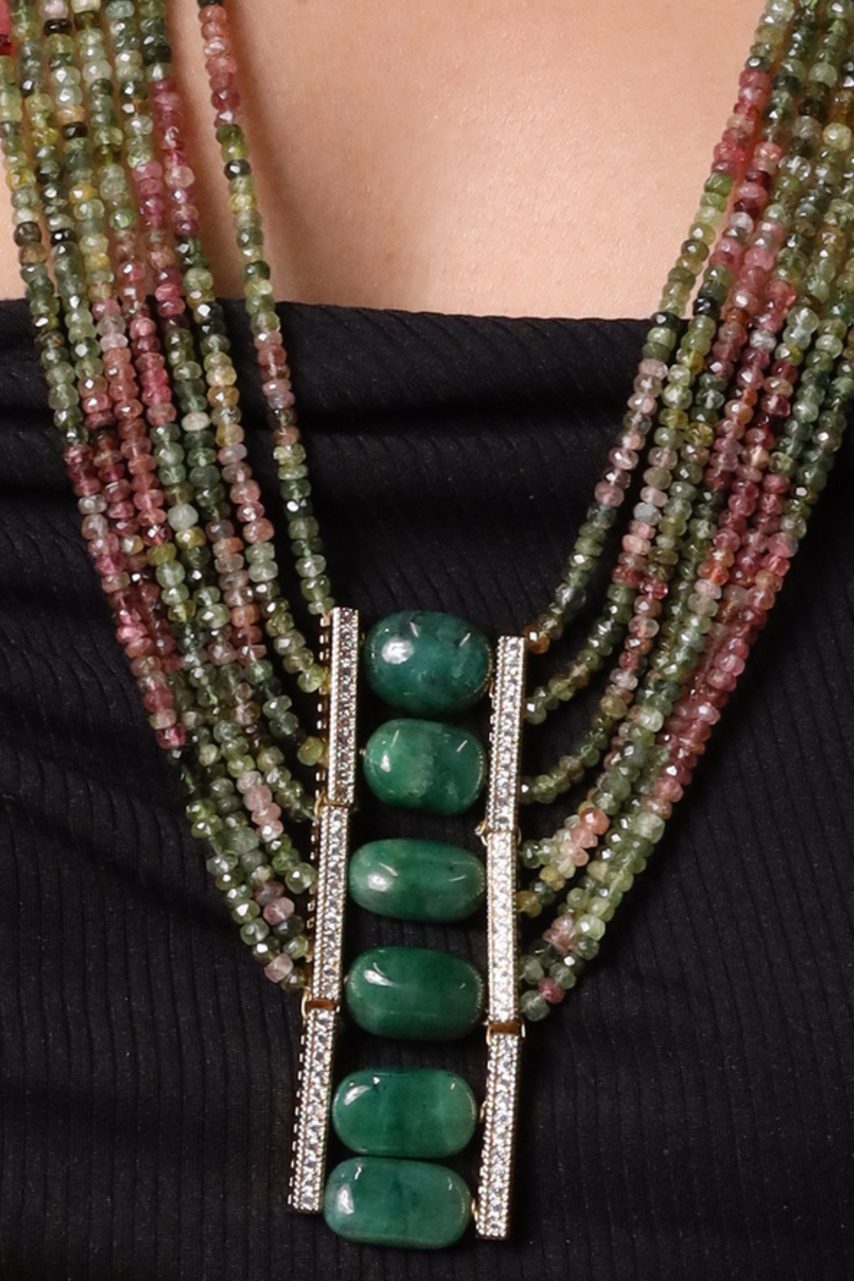 Make a grand statement with our Real Tourmaline with Green Tumbles Seven Line Necklace — a luxurious, layered creation that showcases the beauty of nature in an elegant design. Featuring seven graceful tramline-style strands adorned with polished green tumble stones, this necklace offers depth, movement, and a rich splash of earthy sophistication.